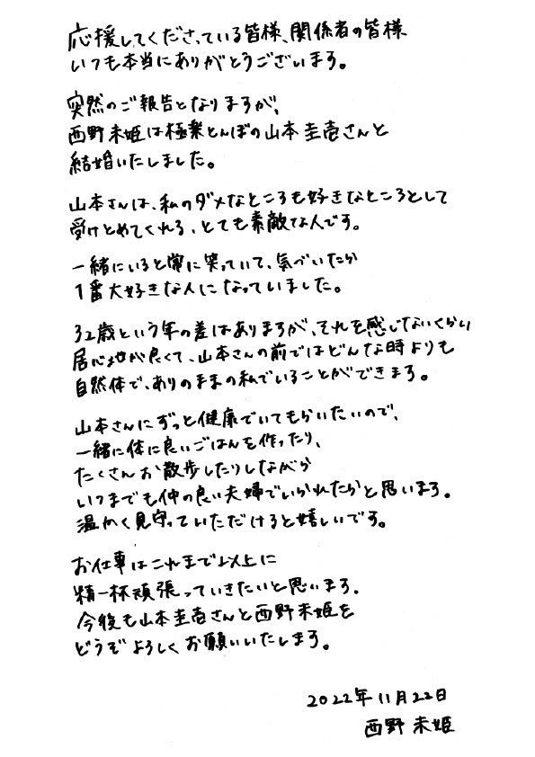 今後も山本圭壱さんと西野未姫をどうぞよろしくお願いいたします。
