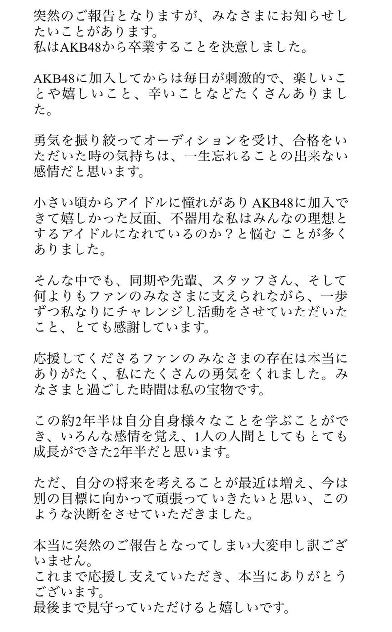 先ほどXで発表させていただいたとおり、私はAKB48から卒業することを決意しました。