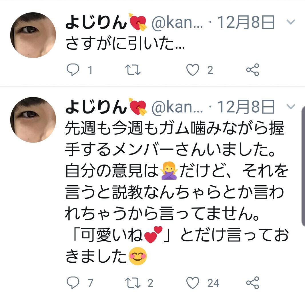 野島がガムを噛みながら握手してたとツイートしてた人か