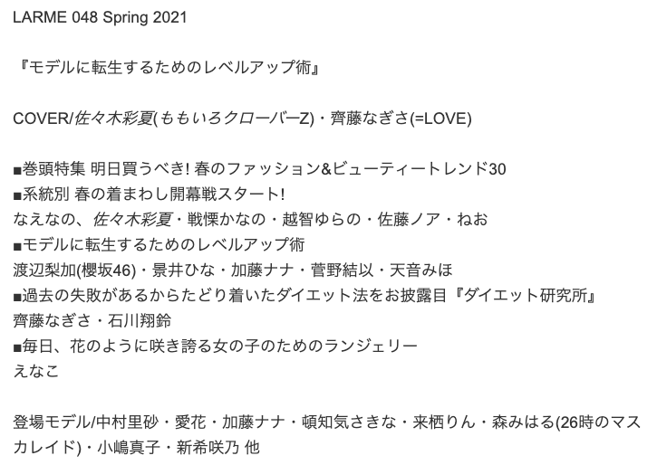 齊藤なぎさがレギュラーモデルを務めるLARMEの表紙が解禁されました