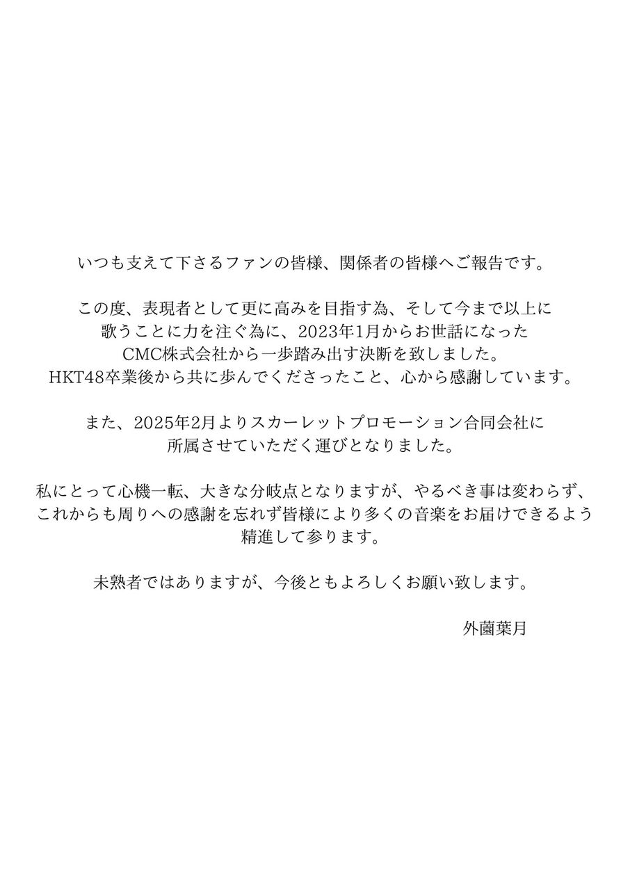 【元HKT48】外薗葉月、「スカーレットプロモーション合同会社」に移籍を発表