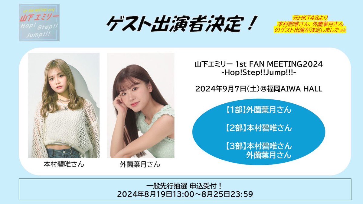 【元HKT48】『山下エミリー 1st FAN MEETING 2024』のゲストに本村碧唯と外薗葉月の出演が決定🎀